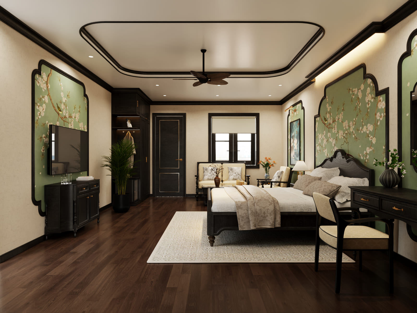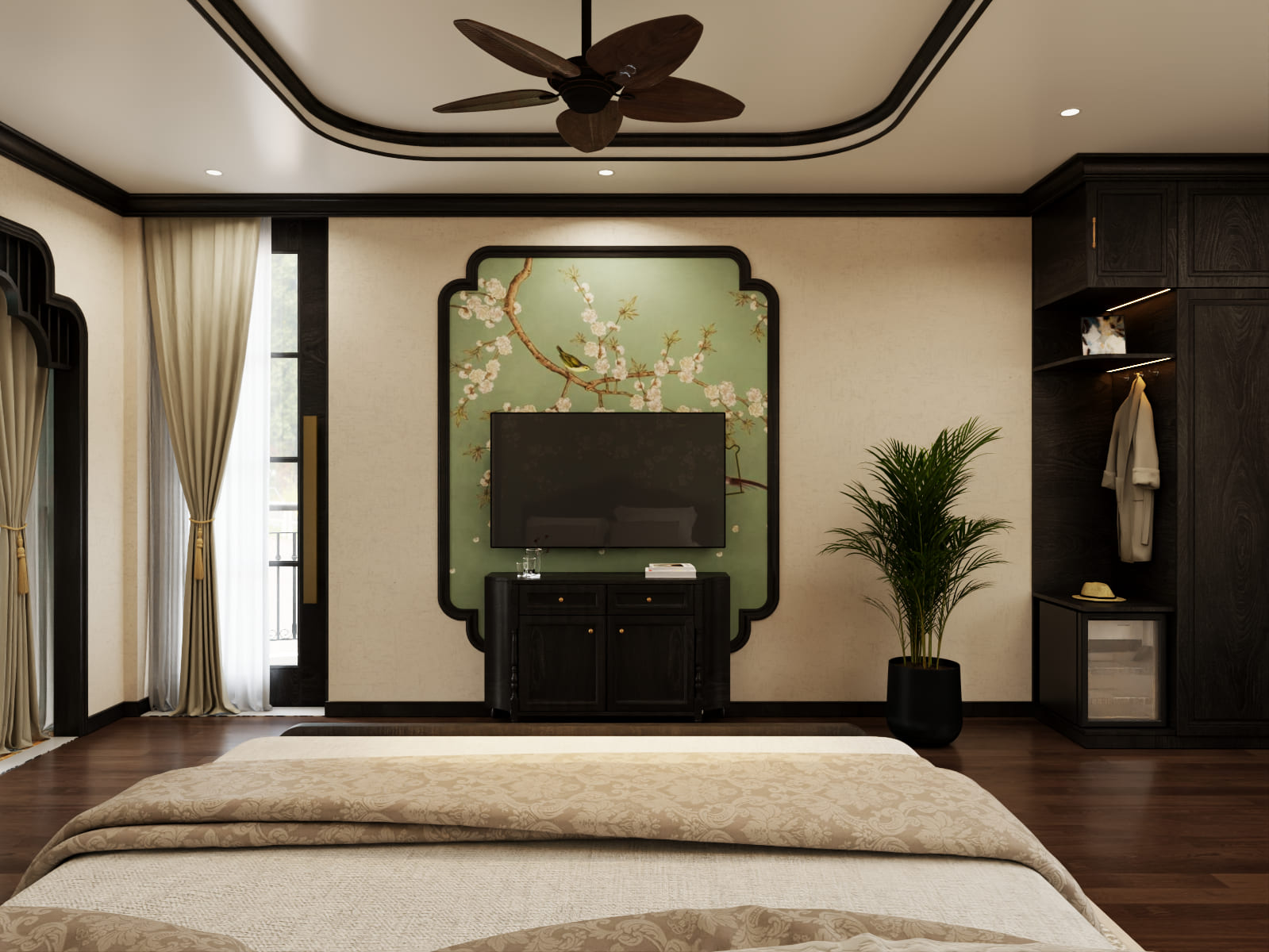 The luxurious 35m² hotel room with a private balcony overlooking the mountains features a king-size bed with comfortable mattresses and neoclassical-style amenities. It also includes a comfortable seating area, a modern mini-fridge, a comfortable bed, a TV with internet access, and a spacious bathroom with modern fixtures. Free high-speed Wi-Fi access is also included.